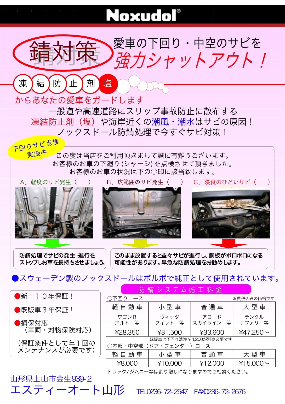 ※保証内容・コーティング剤を塗布した箇所がサビで腐食した場合当社で板金塗装・コーティング剤の再施工をいたします。